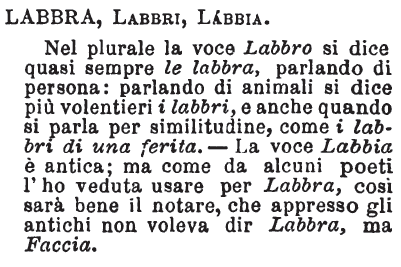 | Labbra, Labbri, Labbia - Nel plurale la voce Labbro si dice quasi sempre le labbra, parlando di persona: parlando di animali si dice più volentieri i labbri, e anche quando si parla per similitudine, come i labbri di una ferita. - La voce Labbia è antica; ma come da alcuni poeti l'ho veduta usare per Labbra, così sarà bene il notare, che appresso gli antichi non voleva dir Labbra, ma Faccia. [immagine] |