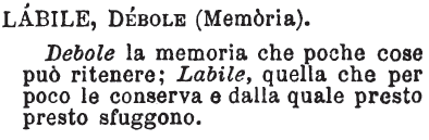 | Labile, Debole (memoria) - Debole la memoria che poche cose può ritenere; Labile, quella che per poco le conserva e dalla quale presto presto sfuggono. [immagine] |