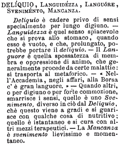 | Deliquio, Languidezza, Languore, Svenimento, Mancanza - Deliquio è cadere privo di sensi specialmente per lungo digiuno. - Languidezza è quel senso spiacevole che si prova allo stomaco, quando esso è vuoto, e che, prolungato, potrebbe portare il deliquio - Il Languore è quella spossatezza di membra e oppressione di animo, che generalmente procede da certe malattie: si trasporta al metaforico. - « Nell'Accademia, negli affari, alla Borsa c'è gran languore. » - Quando altri, o per digiuno o per forte commozione, smarrisce i sensi, quello è uno Svenimento, diverso in ciò dal Deliquio, chè questo viene a gradi e si guarisce con qualche cosa di nutritivo; quello è istantaneo e si cura con altri mezzi terapeutici. - La Mancanza è svenimento lievissimo e momentaneo. [immagine] |