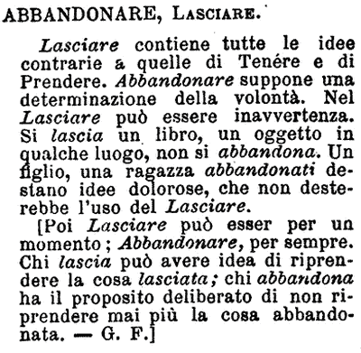 «La principal distinzione di questi due verbi sta in questo, che Abbandonare è lasciar per affatto, e Lasciare è per a tempo. Nell'Abbandonare si ha intenzione di non ripigliare o di non ritornare più alla cosa che si abbandona; nel lasciare non si perde la volontà o la speranza di trovarla. Si lascia un amico, ed è per pochi momenti, onde ritornare a lui fra non molto; ma se si abbandona, è segno che gli si son volte le spalle, e che l'amicizia è rotta.