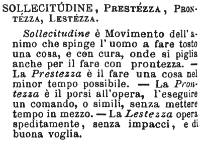 | Sollecitudine, Prestezza, Prontezza, Lestezza - Sollecitudine è Movimento dell'animo che spinge l'uomo a fare tosto una cosa, e con cura, onde si piglia anche per il fare con prontezza. - La Prestezza è il fare una cosa nel minor tempo possibile. - La Prontezza è il porsi all'opera, l'eseguire un comando, o simili, senza mettere tempo in mezzo. - La Lestezza opera speditamente, senza impacci, e di buona voglia. [immagine] |