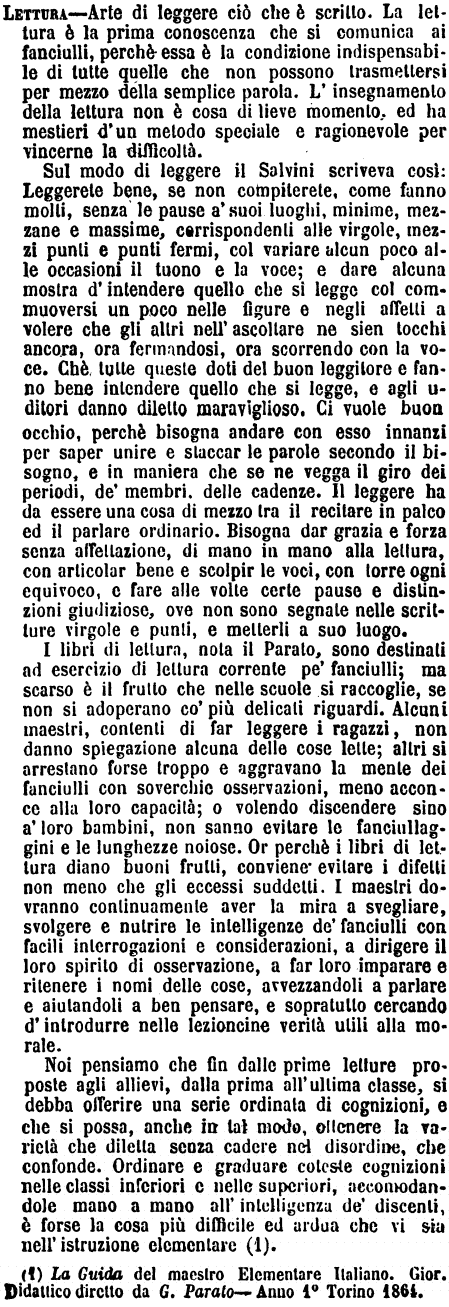I libri di lettura, nota il Parato, sono destinati ad esercizio di lettura corrente pe' fanciulli; ma scarso è il frutto che nelle scuole si raccoglie, se non si adoperano co' più delicati riguardi. Alcuni maestri, contenti di far leggere i ragazzi, non danno spiegazione alcuna delle cose lette; altri si arrestano forse troppo e aggravano la mente dei fanciulli con soverchie osservazioni, meno acconce alla loro capacità; o volendo discendere sino a' loro bambini, non sanno evitare le fanciullaggini e le lunghezze noiose. Or perchè i libri di lettura diano buoni frutti, conviene evitare i difetti non meno che gli eccessi suddetti. I maestri dovranno continuamente aver la mira a svegliare, svolgere e nutrire le intelligenze de' fanciulli con facili interrogazioni e considerazioni, a dirigere il loro spirito di osservazione, a far loro imparare e ritenere i nomi delle cose, avvezzandoli a parlare e aiutandoli a ben pensare, e sopratutto cercando d'introdurre nelle lezioncine verità utili alla morale.