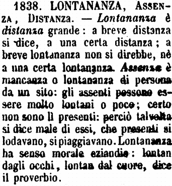| Lontananza, Assenza, Distanza - Lontananza è distanza grande: a breve distanza si dice, a una certa distanza: a breve lontananza non si direbbe, nè a una certa lontananza. Assenza è mancanza o lontananza di persona da un sito: gli assenti possono essere molto lontani o poco; certo non sono lì presenti: perciò talvolta si dice male di essi, che presenti si lodavano, si piaggiavano. Lontananza ha senso morale eziandio: lontan dagli occhi, lontan dal cuore, dice il proverbio. [immagine] |