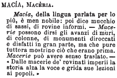 | Macia, Maceria - Macía, della lingua parlata per lo più, è men nobile: poi dice mucchio di sassi, di rovine informi. - Macerie possono dirsi gli avanzi di muri, di colonne, di monumenti diroccati e disfatti in gran parte, ma che pure tuttora mostrino ciò che erano prima. Macerie può avere senso traslato. - «Dalle macerie de' rovinati imperii la storia alza la voce e grida sue lezioni ai popoli» [immagine] |