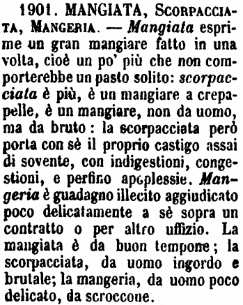 | Mangiata, Scorpacciata, Mangeria - Mangiata esprime un gran mangiare fatto in una volta, cioè un po' più che non comporterebbe un pasto solito: scorpacciata è più, è un mangiare a crepapelle, è un mangiare, non da uomo, ma da bruto: la scorpacciata però porta con sè il proprio castigo assai di sovente, con indigestioni, congestioni, e perfino apoplessie. Mangeria è guadagno illecito aggiudicato poco delicatamente a sè sopra un contratto o per altro uffizio. La mangiata è da buon tempone; la scorpacciata, da uomo ingordo e brutale; la mangeria, da uomo poco delicato, da scroccone. [immagine] |