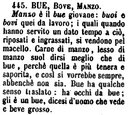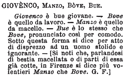 | Giovenco, Manzo, Bove, Bue - Giovenco è bue giovane. - Bove è quello da lavoro. - Manzo è quello da macello. - Bue è lo stesso che Bove, pronunciato così per comodo. Sotto questa forma si dice per atto di disprezzo ad un uomo stolido e ignorante. - [Si noti che, parlandosi di bestia macellata o di parti di essa già cotte, in Firenze si dice più volentieri Manzo che Bove. G. F.] [immagine] |