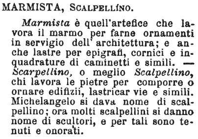 | Marmista, Scalpellino - Marmista è quell'artefice che lavora il marmo per farne ornamenti in servigio dell'architettura; e anche lastre per epigrafi, cornici e inquadrature di caminetti e simili. - Scarpellino, o meglio Scalpellino, chi lavora le pietre per comporre o ornare edifizii, lastricar vie e simili. Michelangelo si dava nome di scalpellino; ora molti scalpellini si danno nome di scultori, e per tali sono tenuti e onorati. [immagine] |