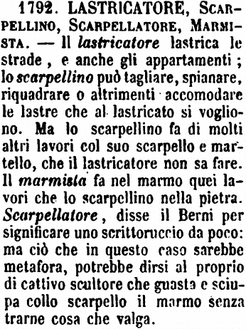 | Lastricatore, Scarpellino, Scarpellatore, Marmista - Il lastricatore lastrica le strade, e anche gli appartamenti; lo scarpellino può tagliare, spianare, riquadrare o altrimenti accomodare le lastre che al lastricato si vogliono. Ma lo scarpellino fa di molti altri lavori col suo scarpello e martello, che il lastricatore non sa fare. Il marmista fa nel marmo quei lavori che lo scarpellino nella pietra. Scarpellatore, disse il Berni per significare uno scrittoruccio da poco: ma ciò che in questo caso sarebbe metafora, potrebbe dirsi al proprio di cattivo scultore che guasta e sciupa collo scarpello il marmo senza trarne cosa che valga. [immagine] |