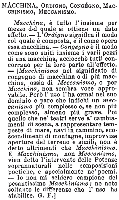 Macchina, Ordigno, Congegno, Macchinismo, Meccanismo - Macchina, è tutto l'insieme per mezzo del quale si ottiene un dato effetto. - L'Ordigno significa il modo col quale è composta, e il come opera essa macchina. - Congegno è il modo come sono uniti insieme i varii pezzi di una macchina, acciocché tutti concorrano per la loro parte all'effetto. - [Macchinismo nel significato di congegno di macchina o di più macchine, ossia di Meccanismo, o per Macchina, non sembra voce approvabile. Però l'uso l'ha ormai nel suo dominio e pare che indichi un meccanismo più complesso e, se non più complesso, almeno più grave. Poi quello che ne' teatri serve a' cambiamenti di scena, a rappresentare tempeste di mare, navi in cammino, scoscendimenti di montagne, improvvise aperture del terreno e simili, non è detto altrimenti che Macchinismo.