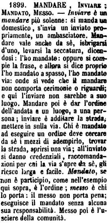 | Mandare, Inviare, Mandato, Messo - Inviare è un mandare più solenne: si manda un domestico, s'invia un inviato propriamente, un ambasciatore. Mandare vale anche da sè, isbrigarsi d'uno, levarsi la seccatura, dicendosi: l'ho mandato: oppure si compie la frase, e allora si dice proprio l'ho mandato a spasso, l'ho mandato via: onde si vede che il mandare non comporta cerimonie o riguardi; e qui l'inviare non sarebbe a suo luogo. Mandare poi è dar l'ordine dell'andata a un luogo, a una persona; inviare è additare la strada, mettere in sulla via. Chi è mandato ad eseguire un ordine deve cercare da sè i mezzi di adempirlo, trovar la strada, aprirsi una via; all'inviato si danno credenziali, raccomandazioni per cui la via s'apre da sè, gli riesce larga e facile. Mandato, se non è participio, come nell'esempio qui sopra, è l'ordine; messo è chi lo porta: il messo non porta pena; eseguisce il mandato senza alcuna sua responsabilità. Messo poi è l'usciere della comunità. [immagine] |