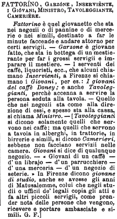 | Fattorino, Garzone, Inserviente, i Giovani, Ministro, Tavoleggiante, Cameriere - Fattorino è quel giovanetto che sta nei negozii o di pannine o di mercerie o nei simili, destinato a far le minute faccende e andare attorno per certi servigii. - Garzone è giovane fatto, che sta in bottega di un mestierante per far i grossi servigii e imparare il mestiere. - I serventi dei caffè, liquoristi, ecc., che alcuni chiamano Inservienti, a Firenze si chiamano i Giovani, per es.: I giovani del caffè Doney; e anche Tavoleggianti, perchè accenna a servire la persona seduta alla tavola. - Quello che nei negozii sta come alla direzione di essi, e spesso sta alla cassa, si chiama Ministro. - [Tavoleggianti si dicono solamente quelli che servono nei caffè; ma quelli che servono a tavola in alberghi, in trattorie, in birrerie e simili, si dicono Camerieri, sebbene non facciano servizii nelle camere. Giovani si dice di qualunque negozio. - «Giovani di un caffè - d'un librajo - d'un parrucchiere - d'una merceria - d'un negozio di seterie.» In Firenze dicono giovane di studio, anche se avesse gli anni di Matusalemme, colui che negli studii o ufficii de' legali copia gli atti e fa altri piccoli servigii, come prender nota delle persone che vengono, ricevere e portare ambasciate e simili. G. F.] [immagine] |