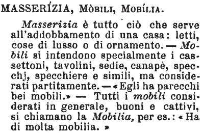 | Masserizia, Mobili, Mobilia - Masserizia è tutto ciò che serve all'addobbamento di una casa: letti, cose di lusso o di ornamento. - Mobili si intendono specialmente i cassettoni, tavolini, sedie, canapè, specchj, specchiere e simili, ma considerati partitamente. - « Egli ha parecchi bei mobili. » - Tutti i mobili considerati in generale, buoni e cattivi, si chiamano la Mobilia, per es.: « Ha di molta mobilia. » [immagine] |