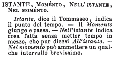 | Istante, Momento, Nell’istante, Nel momento - Istante, dice il Tommaseo, indica il punto del tempo.- Il Momento giunge e passa. - Nell'istante indica cosa fatta senza metter tempo in mezzo, che pur dicesi All'istante. - Nel momento può ammettere un qualche intervallo brevissimo. [immagine] |