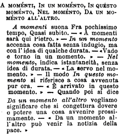 | A momenti, In un momento, In questo momento, Nel momento, Da un momento all'altro - A momenti suona Fra pochissimo tempo, Quasi subito. - «A momenti sarà qui Pietro.» - In un momento accenna cosa fatta senza indugio, ma con l'idea di qualche durata. - «Vado e torno in un momento.» - Nel momento, indica istantaneità, senza idea di durata. - «La servo nel momento.» - Il modo In questo momento si riferisce a cosa avvenuta pur ora. - «E' arrivato in questo momento.» - Quando poi si dice Da un momento all'altro vogliamo significare che si congettura dovere e potere una cosa avvenire prossimamente. - «Da un momento all'altro può venir la notizia della pace.» [immagine] |