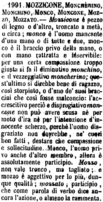 | Mozzicone, Moncherino, Monchino, Monco, Moncone, Mozzo, Mozzato - Mozzicone è pezzo di legno o d'altro, troncato a metà, o circa; monco è l'uomo mancante d'una mano o di tutte e due, monco è il braccio privo della mano, o con mano rattratta e inservibile: per una certa compassione troppo giusta si fa il diminutivo monchino, e il vezzeggiativo moncherino; quest'ultimo si direbbe bene di ragazzo, così storpiato, o d'uno de' suoi braccini che così fosse malconcio: l'accrescitivo perciò e dispregiativo moncone non può avere scusa nè per moto d'ira nè per l'intenzione d'innocente scherzo, perchè l'uomo disgraziato non dovrebbe, ne' cuori ben fatti, destare che compassione e sollecitudine. Monco, l'uomo privo anche d'altro membro, allora è assolutamente participio. Mozzo, non vale tronco, ma tagliato; e mozzo è aggettivo per lo più, dunque qualità; mozzato, participio, che come parola di verbo dice ancora l'azione, o almeno la rammenta. [immagine] |