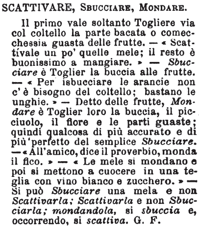 | Scattivare, Sbucciare, Mondare - Il primo vale soltanto Togliere via col coltello la parte bacata o comecchessia guasta delle frutte. - «Scattìvale un po' quelle mele; il resto è buonissimo a mangiare.» - Sbucciare è Toglier la buccia alle frutte. - «Per isbucciare le arancie non c'è bisogno del coltello; bastano le unghie.» - Detto delle frutte, Mondare è Toglier loro la buccia, il picciuolo, il fiore e le parti guaste; quindi qualcosa di più accurato e di più perfetto del semplice Sbucciare. - «All'amico, dice il proverbio, monda il fico.» - «Le mele si mondano e poi si mettono a cuocere in una teglia con vino bianco e zucchero.» - Si può Sbucciare una mela e non Scattivarla; Scattivarla e non Sbucciarla; mondandola, si sbuccia e, occorrendo, si scattiva. G. F. [immagine] |