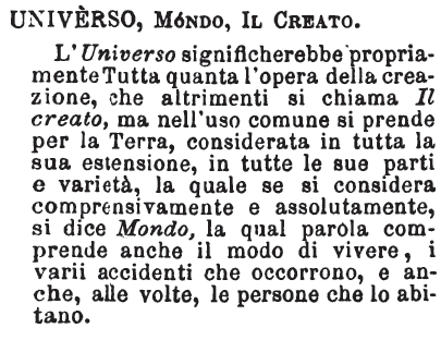 | Universo, Mondo, Il creato - L'Universo significherebbe propriamente Tutta quanta l'opera della creazione, che altrimenti si chiama Il creato, ma nell'uso comune si prende per la Terra, considerata in tutta la sua estensione, in tutte le sue parti e varietà, la quale se si considera comprensivamente e assolutamente, si dice Mondo, la qual parola comprende anche il modo di vivere, i varii accidenti che occorrono, e anche, alle volte, le persone che lo abitano. [immagine] |