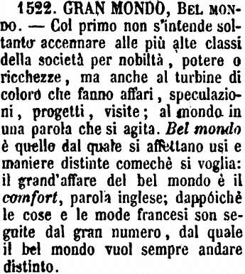 | Gran mondo, Bel mondo - Col primo non s'intende soltanto accennare alle più alte classi della società per nobiltà, potere o ricchezze, ma anche al turbine di coloro che fanno affari, speculazioni, progetti, visite; al mondo in una parola che si agita. Bel mondo è quello dal quale si affettano usi e maniere distinte comechè si voglia: il grand'affare del bel mondo è il comfort, parola inglese; dappoichè le cose e le mode francesi son seguite dal gran numero, dal quale il bel mondo vuol sempre andare distinto. [immagine] |