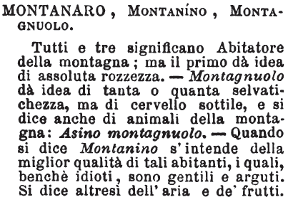 | Montanaro, Montanino, Montagnuolo - Tutti e tre significano Abitatore della montagna; ma il primo dà idea di assoluta rozzezza. - Montagnuolo dà idea di tanta o quanta selvatichezza, ma di cervello sottile, e si dice anche di animali della montagna: Asino montagnuolo. - Quando si dice Montanino s'intende della miglior qualità di tali abitanti, i quali, benchè idioti, sono gentili e arguti. Si dice altresi dell'aria e de' frutti. [immagine] |
