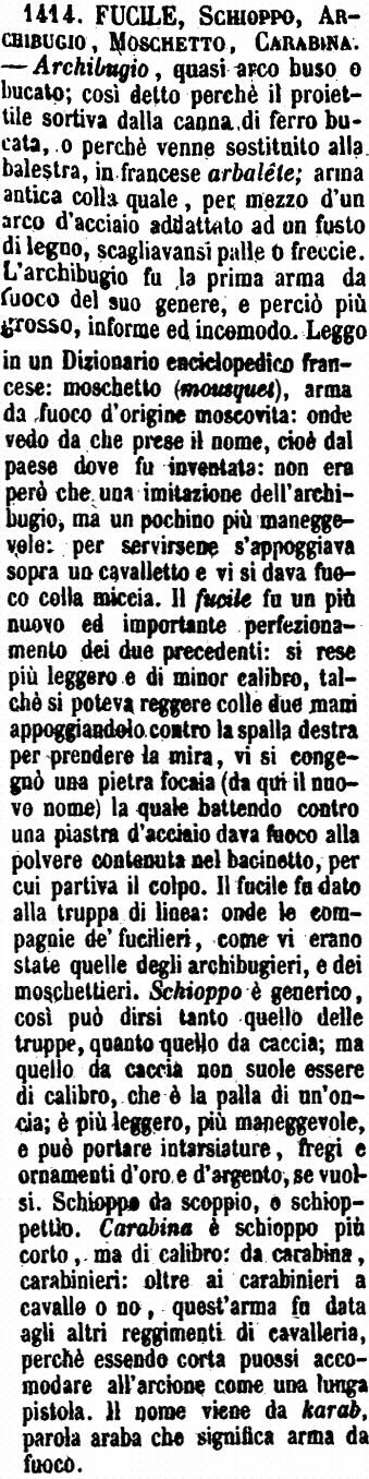 | Fucile, Schioppo, Archibugio, Moschetto, Carabina - Archibugio, quasi arco buso o bucato; così detto perchè il proiettile sortiva dalla canna di ferro bucata, o perchè venne sostituito alla balestra, in francese arbalête; arma antica colla quale, per mezzo d'un arco d'acciaio addattato ad un fusto di legno, scagliavansi palle o freccie. L'archibugio fu la prima arma da fuoco del suo genere, e perciò più grosso, informe ed incomodo. Leggo in un Dizionario enciclopedico francese: moschetto (mousquet), arma da fuoco d'origine moscovita: onde vedo da che prese il nome, cioè dal paese dove fu inventata: non era però che una imitazione dell'archibugio, ma un pochino più maneggevole: per servirsene s'appoggiava sopra un cavalletto e vi si dava fuoco colla miccia. Il fucile fu un più nuovo ed importante perfezionamento dei due precedenti: si rese più leggero e di minor calibro, talchè si poteva reggere colle due mani appoggiandolo contro la spalla destra per prendere la mira, vi si congegnò una pietra focaia (da qui il nuovo nome) la quale battendo contro una piastra d'acciaio dava fuoco alla polvere contenuta nel bacinetto, per cui partiva il colpo. Il fucile fu dato alla truppa di linea: onde le compagnie de' fucilieri, come vi erano state quelle degli archibugieri, e dei moschettieri. Schioppo è generico, così può dirsi tanto quello delle truppe, quanto quello da caccia; ma quello da caccia non suole essere di calibro, che è la palla di un'oncia; è più leggero, più maneggevole, e può portare intarsiature, fregi e ornamenti d'oro e d'argento, se vuolsi. Schioppo da scoppio, o schioppettìo. Carabina è schioppo più corto, ma di calibro: da carabina, carabinieri: oltre ai carabinieri a cavallo o no, quest'arma fu data agli altri reggimenti di cavalleria, perchè essendo corta puossi accomodare all'arcione come una lunga pistola. Il nome viene da karab, parola araba che significa arma da fuoco. [immagine] |