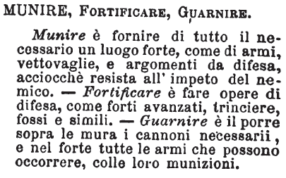 | Munire, Fortificare, Guarnire - Munire è fornire di tutto il necessario un luogo forte, come di armi, vettovaglie, e argomenti da difesa, acciocchè resista all'impeto del nemico. - Fortificare è fare opere di difesa, come forti avanzati, trinciere, fossi e simili. - Guarnire è il porre sopra le mura i cannoni necessarii, e nel forte tutte le armi che possono occorrere, colle loro munizioni. [immagine] |
