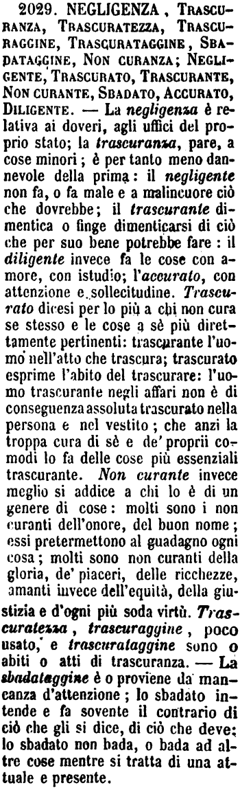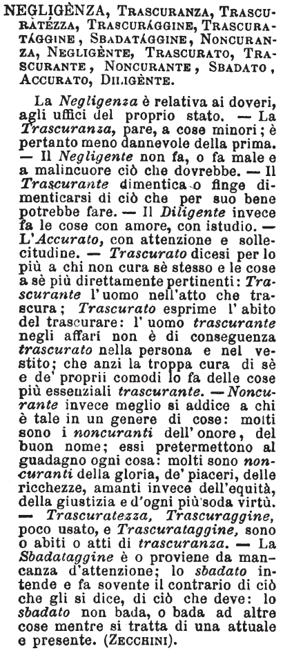 | Negligenza, Trascuranza, Trascuratezza, Trascuraggine, Trascurataggine, Sbadataggine, Non curanza; Negligente, Trascurato, Trascurante, Non curante, Sbadato, Accurato, Diligente - La negligenza è relativa ai doveri, agli uffici del proprio stato; la trascuranza, pare, a cose minori; è per tanto meno dannevole della prima: il negligente non fa, o fa male e a malincuore ciò che dovrebbe; il trascurante dimentica o finge dimenticarsi di ciò che per suo bene potrebbe fare: il diligente invece fa le cose con amore, con istudio; l'accurato, con attenzione e sollecitudine. Trascurato dicesi per lo più a chi non cura se stesso e le cose a sè più direttamente pertinenti: trascurante l'uomo nell'atto che trascura; trascurato esprime l'abito del trascurare: l'uomo trascurante negli affari non è di conseguenza assoluta trascurato nella persona e nel vestito; che anzi la troppa cura di sè e de' proprii comodi lo fa delle cose più essenziali trascurante. Non curante invece meglio si addice a chi lo è di un genere di cose: molti sono i non curanti dell'onore, del buon nome; essi pretermettono al guadagno ogni cosa; molti sono non curanti della gloria, de' piaceri, delle ricchezze, amanti invece dell'equità, della giustizia e d'ogni più soda virtù. Trascuratezza, trascuraggine, poco usato, e trascurataggine sono o abiti o atti di trascuranza. - La sbadataggine è o proviene da mancanza d'attenzione; lo sbadato intende e fa sovente il contrario di ciò che gli si dice, di ciò che deve: lo sbadato non bada, o bada ad altre cose mentre si tratta di una attuale e presente. [immagine] |