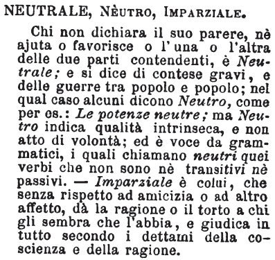 | Neutrale, Neutro, Imparziale - Chi non dichiara il suo parere, nè ajuta o favorisce o l'una o l'altra delle due parti contendenti, è Neutrale; e si dice di contese gravi, e delle guerre tra popolo e popolo; nel qual caso alcuni dicono Neutro, come per es.: Le potenze neutre; ma Neutro indica qualità intrinseca, e non atto di volontà; ed è voce da grammatici, i quali chiamano neutri quei verbi che non sono nè transitivi nè passivi. - Imparziale è colui, che senza rispetto ad amicizia o ad altro affetto, dà la ragione o il torto a chi gli sembra che l'abbia, e giudica in tutto secondo i dettami della coscienza e della ragione. [immagine] |