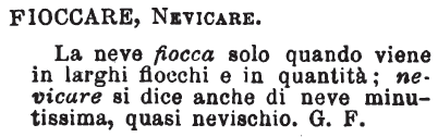 | Fioccare, Nevicare - La neve fiocca solo quando viene in larghi fiocchi e in quantità; nevicare si dice anche di neve minutissima, quasi nevischio. G. F. [immagine] |
