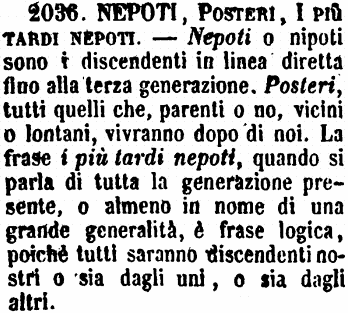 | Nepoti, Posteri, I più tardi nepoti - Nepoti o nipoti sono i discendenti in linea diretta fino alla terza generazione. Posteri, tutti quelli che, parenti o no, vicini o lontani, vivranno dopo di noi. La frase i più tardi nepoti, quando si parla di tutta la generazione presente, o almeno in nome di una grande grande generalità, è frase logica, poichè tutti saranno discendenti nostri o sia dagli uni, o sia dagli altri. [immagine] |