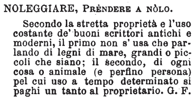 | Noleggiare, Prendere a nolo - Secondo la stretta proprietà e l'uso costante de' buoni scrittori antichi e moderni, il primo non s'usa che parlando di legni di mare, grandi o piccoli che siano; il secondo, d'ogni cosa o animale (e perfino persona) pel cui uso a tempo determinato si paghi un tanto al proprietario. G. F. [immagine] |