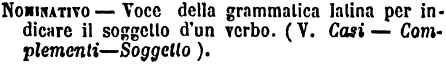 | Nominativo - Voce della grammatica latina per indicare il soggetto d'un verbo. ( V. Casi - Complementi - Soggetto). [immagine] |