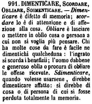 | Dimenticare, Scordare, Obliare, Sdimenticare - Dimenticare è difetto di memoria; scordare lo è di attenzione e di affezione alla cosa. Obliare è lasciare o mettere in oblìo cosa o persona a cui non si voglia più pensare. Chi ha molte cose da fare è facile ne dimentichi qualcheduna: l'ingrato si scorda i benefizii; l'uomo dabbene e generoso oblìa o procura di obliare le offese ricevute. Sdimenticare, quando volesse usarsene, direbbe dimenticare affatto: si direbbe di cosa o di persona di cui si fosse perduta totalmente la memoria. [immagine] |