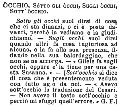 | Occhio, Sotto gli occhi, Sugli occhi, Sott’occhio - Sotto gli occhi suol dirsi di cosa che ci sta dinanzi, o ci è posta davanti, perchè la vediamo e la giudichiamo. - Sugli occhi sul dirsi quando altri fa cosa ingiuriosa ad alcuno, e la fa alla sua presenza, fidando nella sua balordaggine, che non se ne accorga. - «Gliele fa sugli occhi, eppure e' la tiene per una casta Susanna.» - [Sott'occhio si dice di cosa che è presentemente veduta con tutto agio da noi. - «Avevo sott'occhio la traduzione del Cesari. - Non avevo il testo sott'occhio e perciò mi sfuggi quell'errore.» G. F.] [immagine] |