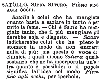 | Satollo, Sazio, Saturo, Pieno fino agli occhi - Satollo è colui che ha mangiato quanto basta a saziare in tutto e per tutto la fame. - Chi è Sazio ha mangiato tanto, che il più mangiare gli darebbe noja e disgusto. - Saturo indicherebbe colui che ha pieno lo stomaco in modo da non entrarci nulla di più; ma questa è voce dei chimici, i quali dicono Satura quella sostanza che ne ha incorporata un'altra quanto è possibile; e il popolo significa tal'idea col modo Pieno fino agli occhi, per iperbole. [immagine] |