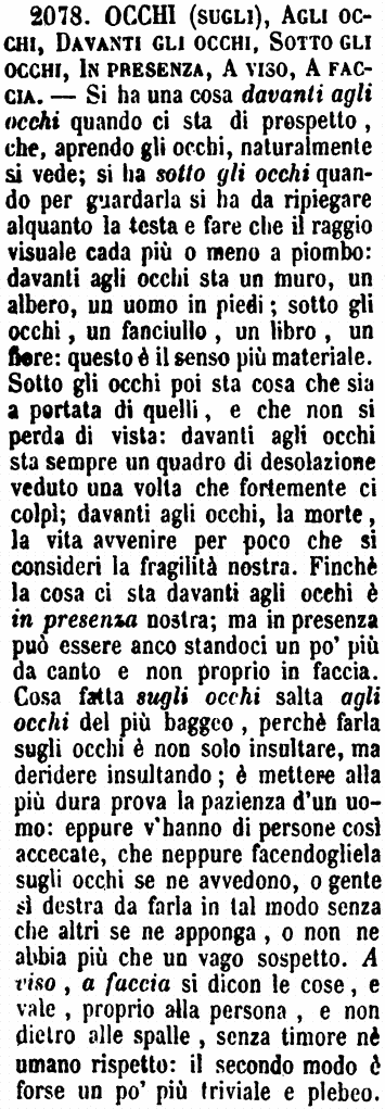 | Occhi (Sugli), Agli occhi, Davanti gli occhi, Sotto gli occhi, In presenza, A viso, A faccia - Si ha una cosa davanti agli occhi quando ci sta di prospetto, che, aprendo gli occhi, naturalmente si vede; si ha sotto gli occhi quando per guardarla si ha da ripiegare alquanto la testa e fare che il raggio visuale cada più o meno a piombo: davanti agli occhi sta un muro, un albero, un uomo in piedi; sotto gli occhi, un fanciullo, un libro, un fiore: questo è il senso più materiale. Sotto gli occhi poi sta cosa che sia a portata di quelli, e che non si perda di vista: davanti agli occhi sta sempre un quadro di desolazione veduto una volta che fortemente ci colpì; davanti agli occhi, la morte, la vita avvenire per poco che si consideri la fragilità nostra. Finchè la cosa ci sta davanti agli occhi è in presenza nostra; ma in presenza può essere anco standoci un po' più da canto e non proprio in faccia. Cosa fatta sugli occhi salta agli occhi del più baggeo, perchè farla sugli occhi è non solo insultare, ma deridere insultando; è mettere alla più dura prova la pazienza d'un uomo: eppure v'hanno di persone così accecate, che neppure facendogliela sugli occhi se ne avvedono, o gente sì destra da farla in tal modo senza che altri se ne apponga, o non ne abbia più che un vago sospetto. A viso, a faccia si dicon le cose, e vale, proprio alla persona, e non dietro alle spalle, senza timore nè umano rispetto: il secondo modo è forse un po' più triviale e plebeo. [immagine] |