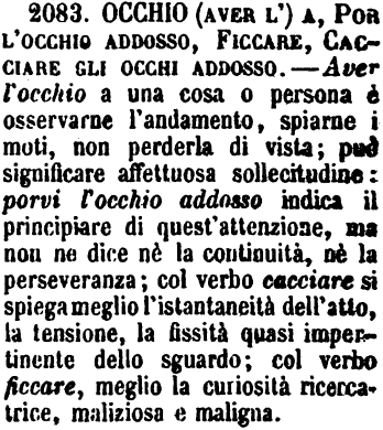 | Occhio (aver l'), Por l'occhio addosso, Ficcare, Cacciare gli occhi addosso - Aver l'occhio a una cosa o persona è osservarne l'andamento, spiarne i moti, non perderla di vista; può significare affettuosa sollecitudine: porvi l'occhio addosso indica il principiare di quest'attenzione, ma non ne dice nè la continuità, nè la perseveranza; col verbo cacciare si spiega meglio l'istantaneità dell'atto, la tensione, la fissità quasi impertinente dello sguardo; col verbo ficcare, meglio la curiosità ricercatrice, maliziosa e maligna. [immagine] |