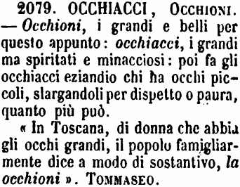 «In Toscana, di donna che abbia gli occhi grandi, il popolo famigliarmente dice a modo di sostantivo, la occhioni». Tommaseo. [immagine] |