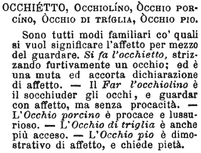 | Occhietto, Occhiolino, Occhio porcino, Occhio di triglia, Occhio pio - Sono tutti modi familiari co' quali si vuol significare l'affetto per mezzo del guardare. Si fa l'occhietto, strizzando furtivamente un occhio; ed è una muta ed accorta dichiarazione di affetto. - Il Far l'occhiolino è il socchiuder gli occhi, e guardar con affetto, ma senza procacità. - L'Occhio porcino è procace e lussurioso. - L'Occhio di triglia è anche più acceso. - L'Occhio pio è dimostrativo di affetto, e chiede pietà. [immagine] |