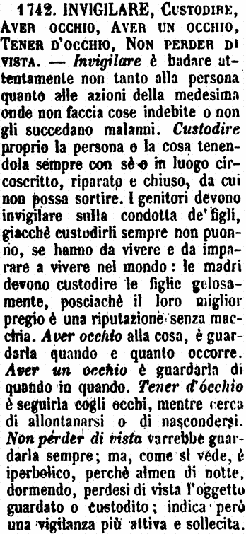 | Invigilare, Custodire, Aver occhio, Aver un occhio, Tener d’occhio, Non perder di vista - Invigilare è badare attentamente non tanto alla persona quanto alle azioni della medesima onde non faccia cose indebite o non gli succedano malanni. Custodire proprio la persona o la cosa tenendola sempre con sè o in luogo circoscritto, riparato e chiuso, da cui non possa sortire. I genitori devono invigilare sulla condotta de' figli, giacchè custodirli sempre non puonno, se hanno da vivere e da imparare a vivere nel mondo: le madri devono custodire le figlie gelosamente, posciachè il loro miglior pregio è una riputazione senza macchia. Aver occhio alla cosa, è guardarla quando e quanto occorre. Aver un occhio è guardarla di quando in quando. Tener d'occhio è seguirla cogli occhi, mentre cerca di allontanarsi o di nascondersi. Non perder di vista varrebbe guardarla sempre; ma, come si vede, è iperbolico, perchè almen di notte, dormendo, perdesi di vista l'oggetto guardato o custodito; indica però una vigilanza più attiva e sollecita. [immagine] |