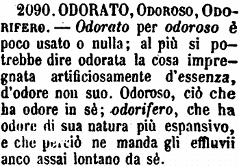 | Odorato, Odoroso, Odorifero - Odorato per odoroso è poco usato o nulla; al più si potrebbe dire odorata la cosa impregnata artificiosamente d'essenza, d'odore non suo. Odoroso, ciò che ha odore in sè; odorifero, che ha odore di sua natura più espansivo, e che perciò ne manda gli effluvii anco assai lontano da sè. [immagine] |