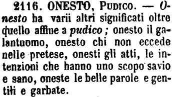| Onesto, Pudico - Onesto ha varii altri significali oltre quello affine a pudico; onesto il galantuomo, onesto chi non eccede nelle pretese, onesti gli atti, le intenzioni che hanno uno scopo savio e sano, oneste le belle parole e gentili e garbate. [immagine] |