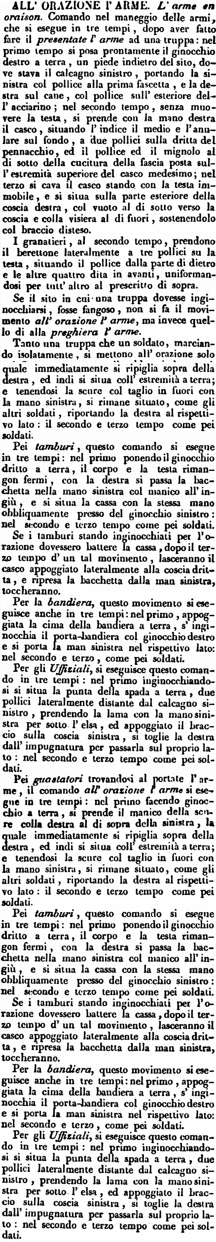 | All'orazione l'arme - L'arme en oraison. Comando nel maneggio delle armi, che si esegue in tre tempi, dopo aver fatto fare il presentate l'arme ad una truppa: nel primo tempo si posa prontamente il ginocchio destro a terra, un piede indietro del sito, dove stava il calcagno sinistro, portando la sinistra col pollice alla prima fascetta, e la destra sul cane, col pollice sull'esteriore dell'acciarino; nel secondo tempo, senza muovere la testa, si prende con la mano destra il casco, situando l'indice il medio e l'anulare sul fondo, a due pollici sulla dritta del pennacchio, ed il pollice ed il mignolo al di sotto della cucitura della fascia posta sull'estremità superiore del casco medesimo; nel terzo si cava il casco stando con la testa immobile, e si situa sulla parte esteriore della coscia destra, col vuoto al di sotto verso la coscia e colla visiera al di fuori, sostenendolo col braccio disteso.