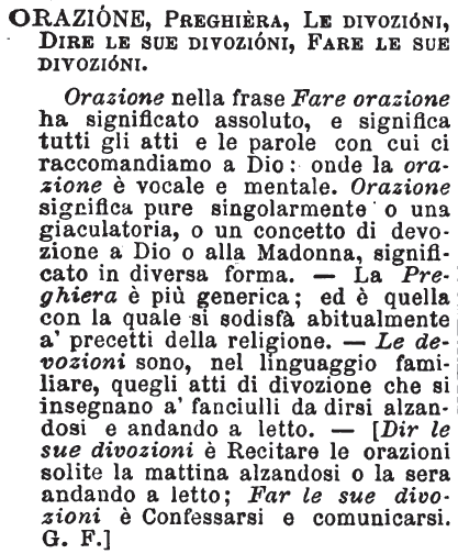| Orazione, Preghiera, Le divozioni, Dire le sue divozioni, Fare le sue divozioni - Orazione nella frase Fare orazione ha significato assoluto, e significa tutti gli atti e le parole con cui ci raccomandiamo a Dio: onde la orazione è vocale e mentale. Orazione significa pure singolarmente o una giaculatoria, o un concetto di devozione a Dio o alla Madonna, significato in diversa forma. - La Preghiera è più generica; ed è quella con la quale si sodisfà abitualmente a' precetti della religione. - Le devozioni sono, nel linguaggio familiare, quegli atti di divozione che si insegnano a' fanciulli da dirsi alzandosi e andando a letto. - [Dir le sue divozioni è Recitare le orazioni solite la mattina alzandosi o la sera andando a letto; Far le sue divozioni è Confessarsi e comunicarsi. G. F.] [immagine] |