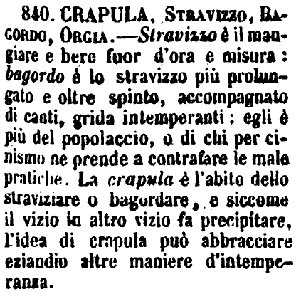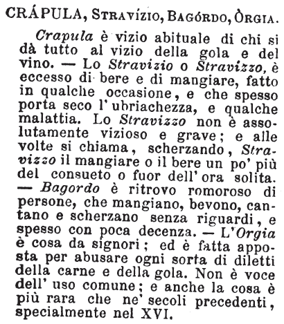 | Crapula, Stravizzo, Bagordo, Orgia - Stravizzo è il mangiare e bere fuor d'ora e misura: bagordo è lo stravizzo più prolungato e oltre spinto, accompagnato di canti, grida intemperanti: egli è più del popolaccio, o di chi per cinismo ne prende a contrafare le male pratiche. La crapula è l'abito dello straviziare o bagordare, e siccome il vizio in altro vizio fa precipitare, l'idea di crapula può abbracciare eziandio altre maniere d'intemperanza. [immagine] |