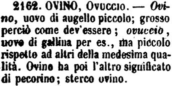 | Ovino, Ovuccio - Ovino, uovo di augello piccolo; grosso perciò come dev'essere; ovuccio, uovo di gallina per es., ma piccolo rispetto ad altri della medesima qualità. Ovino ha poi l'altro significato di pecorino; sterco ovino. [immagine] |