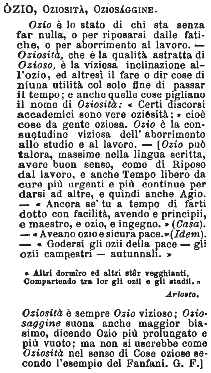 Oziosità è sempre Ozio vizioso; Oziosaggine suona anche maggior biasimo, dicendo Ozio più prolungato e più vuoto; ma non si userebbe come Oziosità nel senso di Cose oziose secondo l'esempio del Fanfani. G. F.] [immagine] |