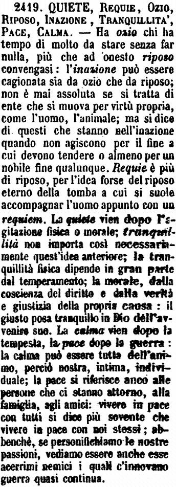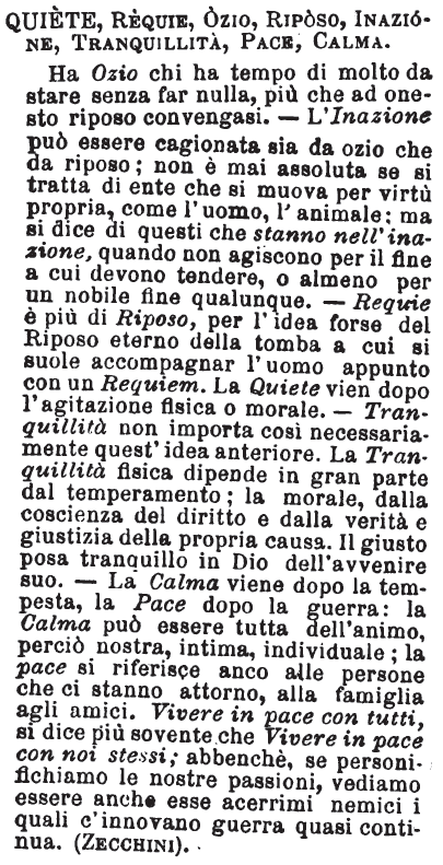 | Quiete, Requie, Ozio, Riposo, Inazione, Tranquillità, Pace, Calma - Ha ozio chi ha tempo di molto da stare senza far nulla, più che ad onesto riposo convengasi: l'inazione può essere cagionata sia da ozio che da riposo; non è mai assoluta se si tratta di ente che si muova per virtù propria, come l'uomo, l'animale; ma si dice di questi che stanno nell'inazione quando non agiscono per il fine a cui devono tendere o almeno per un nobile fine qualunque. Requie è più di riposo, per l'idea forse del riposo eterno della tomba a cui si suole accompagnar l'uomo appunto con un requiem. La quiete vien dopo l'agitazione fisica o morale; tranquillità non importa così necessariamente quest'idea anteriore; la tranquillità fisica dipende in gran parte dal temperamento; la morale, dalla coscienza del diritto e dalla verità e giustizia della propria causa: il giusto posa tranquillo in Dio dell'avvenire suo. La calma vien dopo la tempesta, la pace dopo la guerra: la calma può essere tutta dell'animo, perciò nostra, intima, individuale; la pace si riferisce anco alle persone che ci stanno attorno, alla famiglia, agli amici: vivere in pace con tutti si dice più sovente che vivere in pace con noi stessi; abbenchè, se personifichiamo le nostre passioni, vediamo essere anche esse acerrimi nemici i quali c'innovano guerra quasi continua. [immagine] |