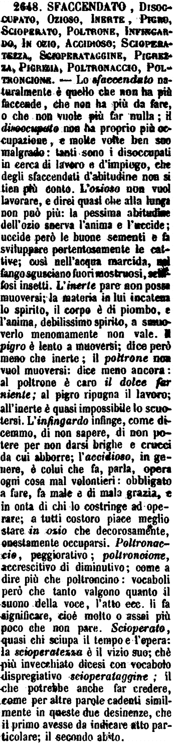 | Sfaccendato, Disoccupato, Ozioso, Inerte, Pigro, Scioperato, Poltrone, Infingardo, In ozio, Accidioso; Scioperatezza, Scioperataggine, Pigrezza, Pigrizia, Poltronaccio, Poltroncione - Lo sfaccendato naturalmente è quello che non ha più faccende, che non ha più da fare, o che non vuole più far nulla; il disoccupato non ha proprio più occupazione, e molte volte ben suo malgrado: tanti sono i disoccupati in cerca di lavoro e d'impiego, che degli sfaccendati d'abitudine non si tien più conto. L'ozioso non vuol lavorare, e direi quasi che alla lunga non può più: la pessima abitudine dell'ozio snerva l'anima e l'uccide; uccide però le buone sementi e fa sviluppare portentosamente le cattive; così nell'acqua marcida, nel fango sgusciano fuori mostruosi, schifosi insetti. L'inerte pare non possa muoversi; la materia in lui incatena lo spirito, il corpo è di piombo, e l'anima, debilissimo spirito, a smuoverlo menomamente non vale. Il pigro è lento a muoversi; dice però meno che inerte; il poltrone non vuol muoversi: dice meno ancora: al poltrone è caro il dolce far niente; al pigro ripugna il lavoro; all'inerte è quasi impossibile lo scuotersi. L'infingardo infinge, come dicemmo, di non sapere, di non potere per non darsi brighe e crucci da cui abborre; l'accidioso, in genere, è colui che fa, parla, opera ogni cosa mal volentieri: obbligato a fare, fa male e di mala grazia, e in onta di chi lo costringe ad operare; a tutti costoro piace meglio stare in ozio che decorosamente, onestamente occuparsi. Poltronaccio, peggiorativo; poltroncione, accrescitivo di diminutivo; come a dire più che poltroncino: vocaboli però che tanto valgono quanto il suono della voce, l'atto ecc. li fa significare, cioè molto o assai più poco che non pare. Scioperato, quasi chi sciupa il tempo e l'opera: la scioperatezza è il vizio suo; chè più invecchiato dicesi con vocabolo dispregiativo scioperataggine; il che potrebbe anche far credere, come per altre parole cadenti similmente in queste due desinenze, che il primo avesse da indicare atto particolare; il secondo abito. [immagine] |