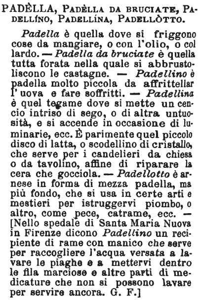 | Padellotto - S. m. Padella piuttosto grande. Art Vetr. Ner. 1. 22. (C) Per far un'acqua marina di garbo e bella, si piglierà la fritta di cristallo, e metterà in padellotto. E appresso: A un padellotto di libbre venti di cristallo incirca si pigli once sei di canterello calcinato, e preparato.