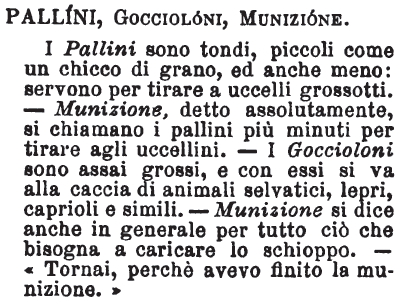 | Pallini, Goccioloni, Munizione - I Pallini sono tondi, piccoli come un chicco di grano, ed anche meno: servono per tirare a uccelli grossotti. - Munizione, detto assolutamente, si chiamano i pallini più minuti per tirare agli uccellini. - I Goccioloni sono assai grossi, e con essi si va alla caccia di animali selvatici, lepri, caprioli e simili. - Munizione si dice anche in generale per tutto ciò che bisogna a caricare lo schioppo. - « Tornai, perché avevo finito la munizione. » [immagine] |